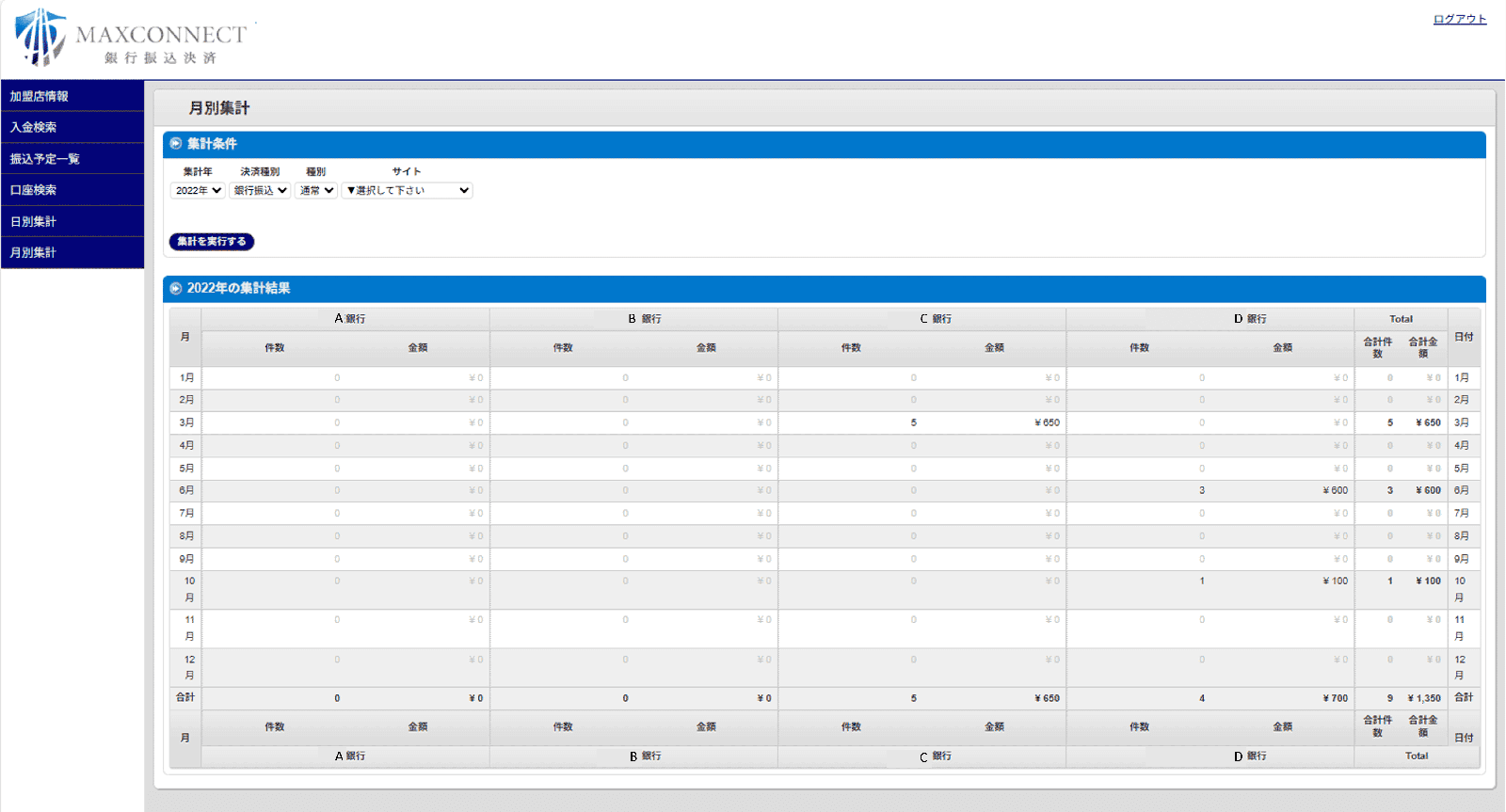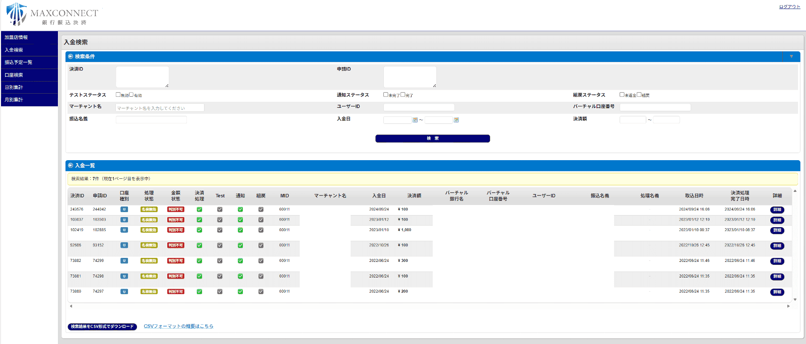 エンドユーザー様からのご入金情報を、月別または任意の期間を指定して確認できます。決済IDやユーザーID、決済額等の絞り込み機能が充実しているため、特定の決済の確認もスムーズです。