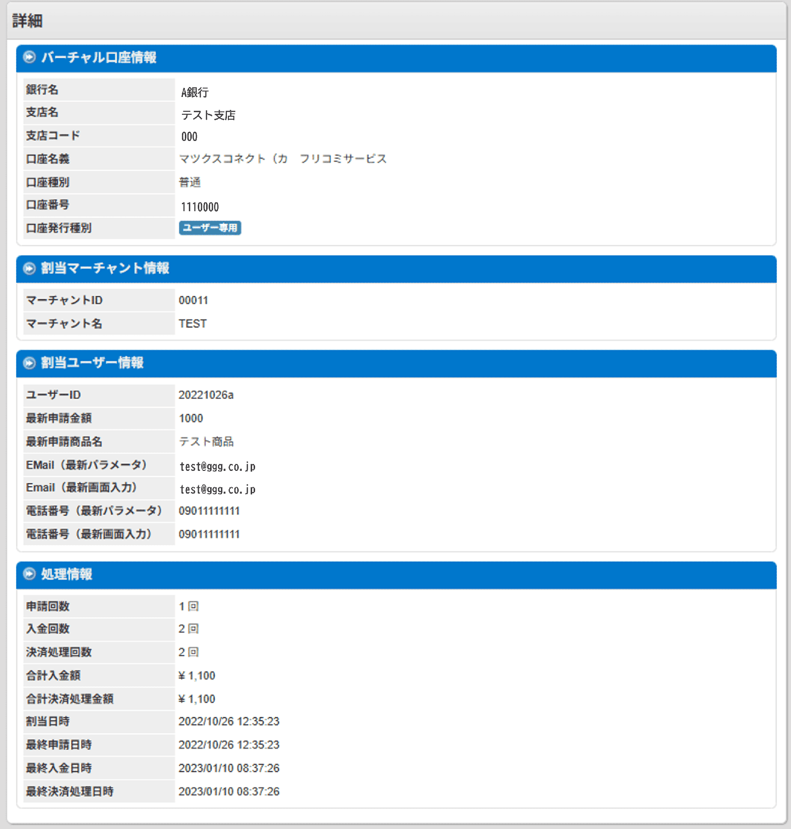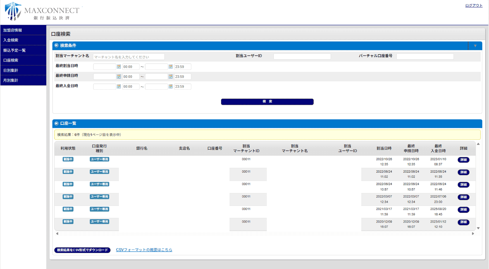 エンドユーザー様に割り当てられたバーチャル口座の情報を閲覧できます。最終申請日時や最終入金日時が確認できるため、未入金のエンドユーザー様をスムーズに特定できます。
