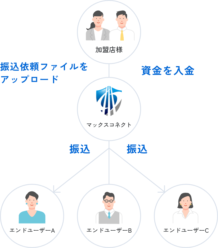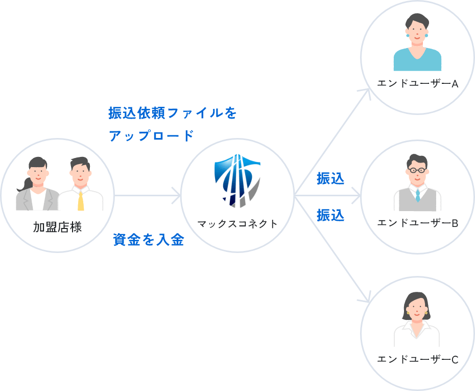パソコンから、振込データ(全銀データやCSV)をアップロードするだけで、安全かつ確実に指定の口座へ送金できます。毎日多数の振込手配が発生している加盟店様や、給与振り込み件数の多い加盟店様に最適なサービスです。